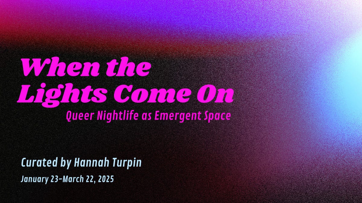 “When the Lights Come On brings together local, national, and international artists reflecting on their experiences of queer nightlife. Historically, queer nightlife spaces have emerged out of necessity, as acts of rebelliousness that prioritize pleasure, self-expression, vulnerability, and intimacy within the face of oppression. Informed by the work of writers like adrienne maree brown and Audre Lorde, the exhibition looks at these gatherings as sites of communal adaptation and resilience, amplifying how radical love and pleasure are necessary for imagining a more liberated future. Exhibited artists include Harrison Apple, Théo Bignon, Clint Fisher, ggggrimes, Jules Malice, Amanda Pickler, Nica Ross, Janie Stamm, Mary Tremonte, True T Pittsburgh, Jimmy Wright, and huny young.”